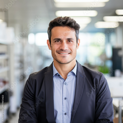Confident Hispanic businessman in a professional office environment smiling at camera