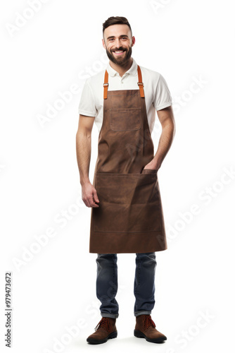 Friendly male butcher smiling in white apron and casual attire, full body shot on white background