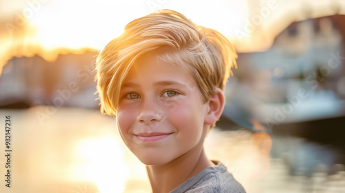 Playful Danish teenage boy enjoying sunset by the waterfront