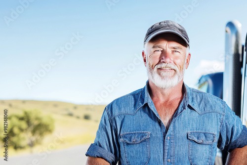 Mature truck driver standing confidently beside his vehicle on a sunny day
