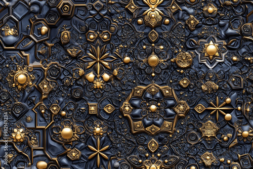 Seamless geometric pattern with intricate gold star shapes on dark background