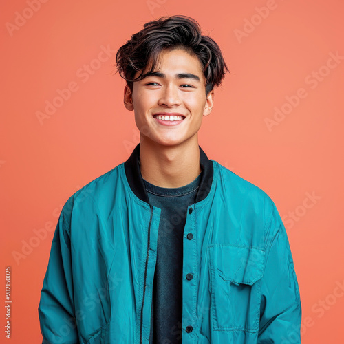 Smiling Southeast Asian teen male with dark brown hair wearing a teal jacket against a coral background, conveying happiness and youthful energy