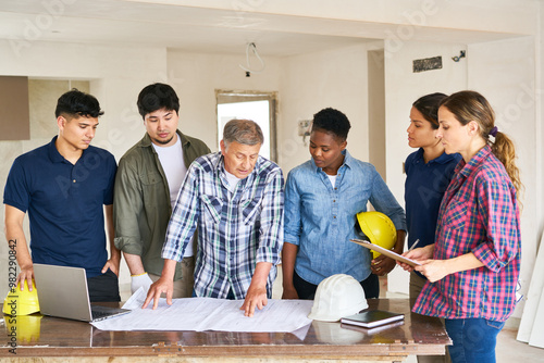 Team of construction workers and senior architect discussing over blueprint design in meeting at incomplete house