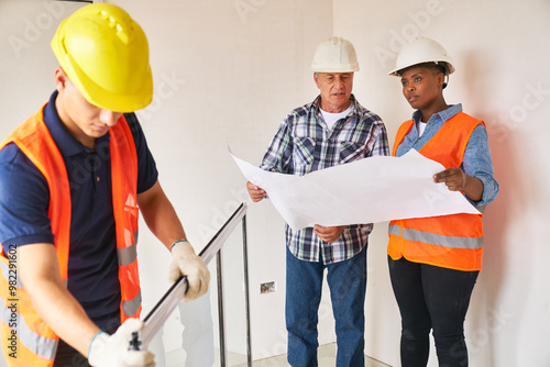Senior male supervisor discussing over blueprint with female worker near carpenter holding window frame at incomplete house