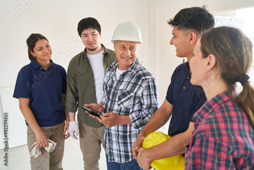 Smiling senior male builder holding tablet PC discussing with construction team while standing together inside incomplete house