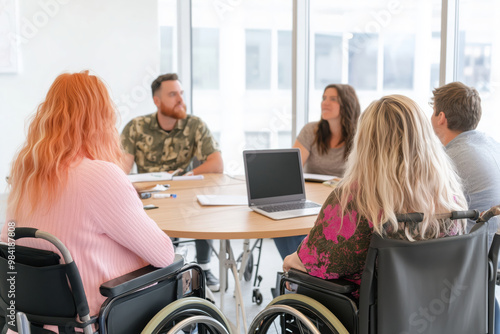 Diverse group of professionals in a meeting, focusing on collaboration and inclusion with individuals in wheelchairs around a conference table, fostering teamwork and accessibility