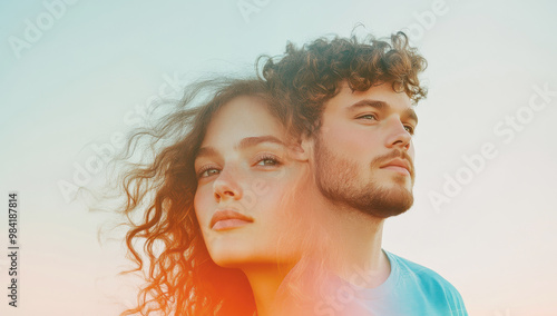 Double exposure of a man and woman looking in opposite directions with overlapping features, symbolizing connection and introspection.