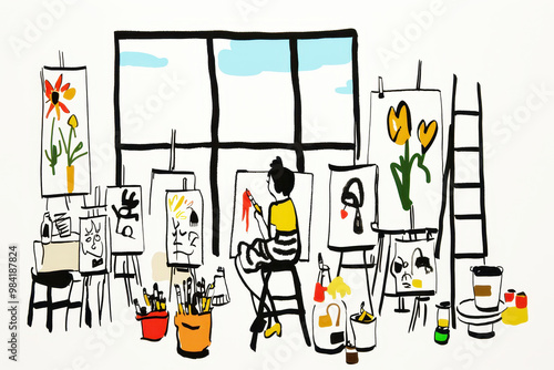 Creative female artist in her 30s painting on a large canvas in a bright studio filled with colorful, abstract art