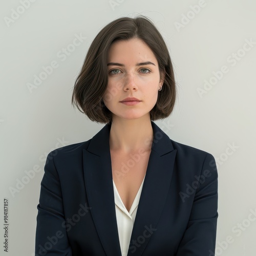 Focused young woman with a sleek bob wearing a blazer, symbolizing confidence and professionalism in a corporate setting