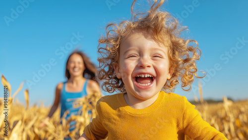 Joyful child laughing while running through a sunlit cornfield with a carefree adult woman on a bright sunny day in nature