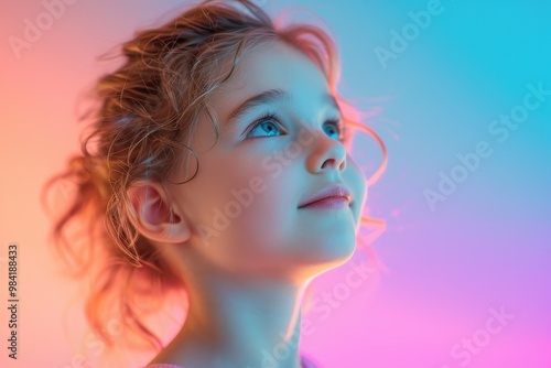 Adorable European child with radiant skin illuminated by pastel colors
