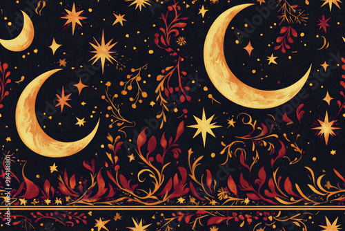 Seamless festive pattern with crescent moons, stars, and intricate details