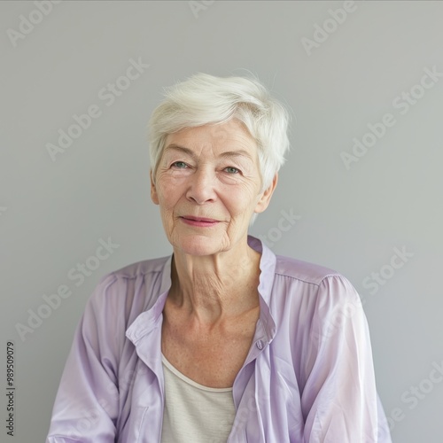 Happy elderly woman in her 70s with medium length gray hair smiling warmly in a purple shirt, conveying positivity and wisdom