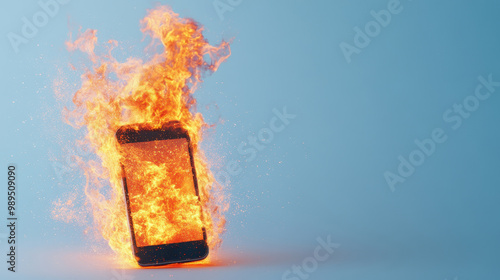 Smartphone engulfed in flames, depicting technology hazards and device overheating in a dramatic fiery scene