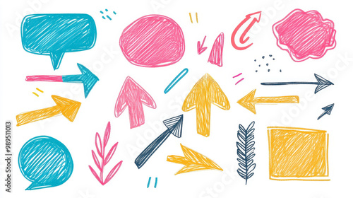 Hand-drawn arrows and speech bubble vector set in vibrant colors for creative design projects.