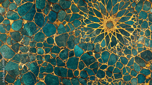Elegant and intricate seamless pattern with Islamic geometric design in teal and gold