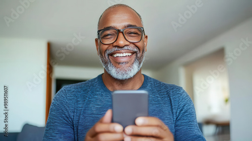 Mature man wearing glasses smiling while reading a positive message on his mobile phone in a bright living room setting