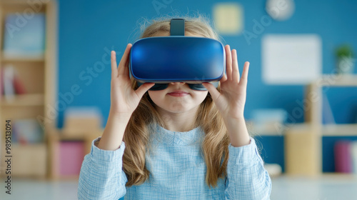 Young student experiencing virtual reality technology with a VR headset in a modern classroom for interactive learning and exploration.