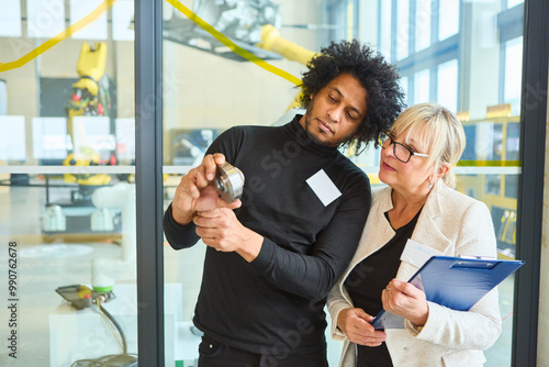 Engineers inspecting robotic gripper part in industrial workspace for automation process