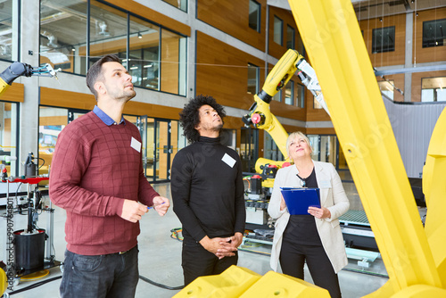 Group of engineers discussing robotics and automation in a modern industrial facility