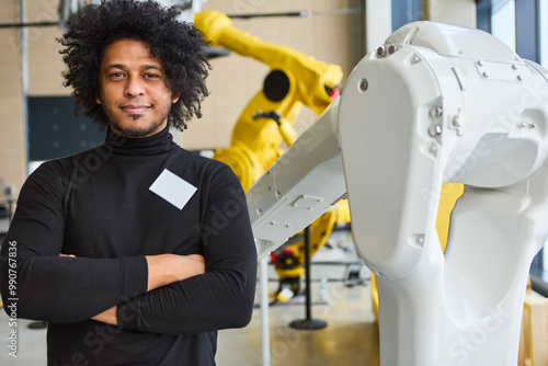 Engineer with folded arms standing next to industrial robot in modern robotics workshop