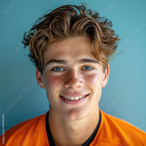Radiant Canadian teenager with sporty haircut and freckles, portrait against blue background
