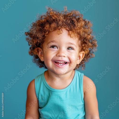 Adorable baby girl with curly hair smiling joyfully in a turquoise dress with a teal background, capturing the essence of innocence and happiness