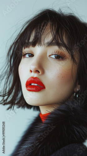Close-up shot of a Japanese fashion model with bold red lipstick and short haircut