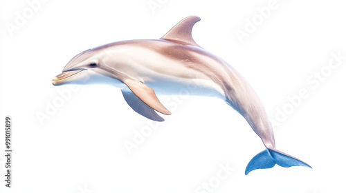 A whimsical and cute dolphin floats gracefully in a clear sky with a soft white background, creating a surreal imagery of freedom and tranquility.