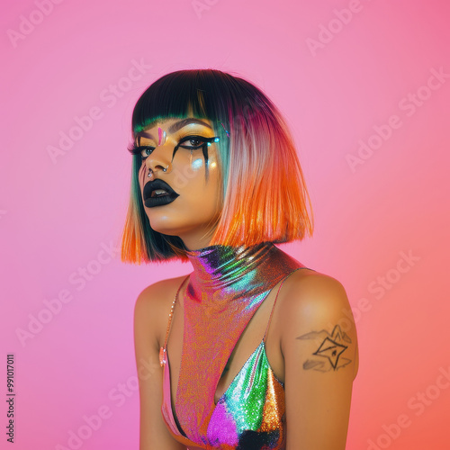 Fierce portrait of a person with vibrant bob haircut and black lipstick against a colorful background, exuding boldness and creativity through unique makeup and metallic fashion.