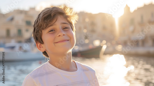 Serene Maltese waterfront scene with a playful young boy gazing at the sunset