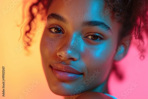 Portrait of a Caribbean teenager with beautiful skin in colorful neon lighting