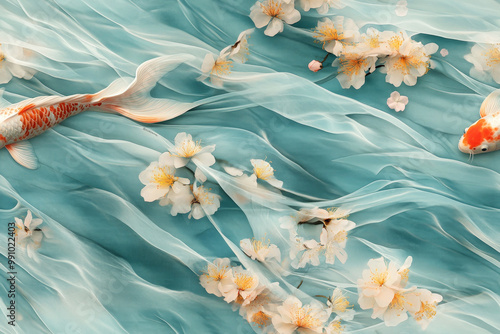 Seamless koi fish with cherry blossoms in gentle aqua waves