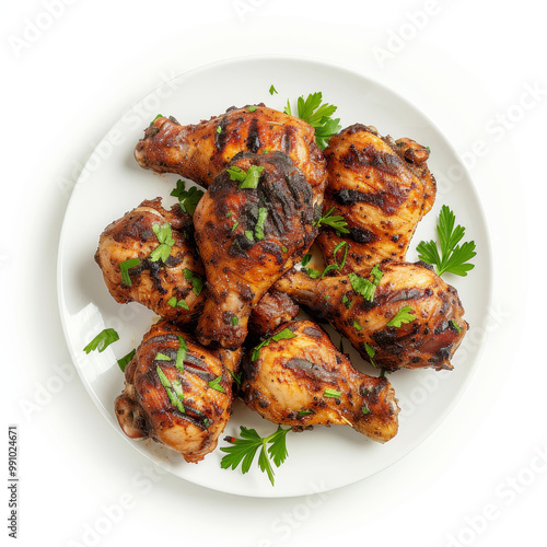 Top view of delicious jerk chicken on a white plate, garnished with fresh parsley