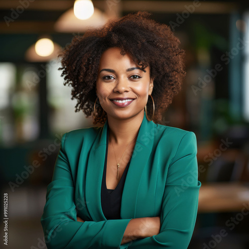 Confident Brazilian businesswoman with curly hair smiling in office setting