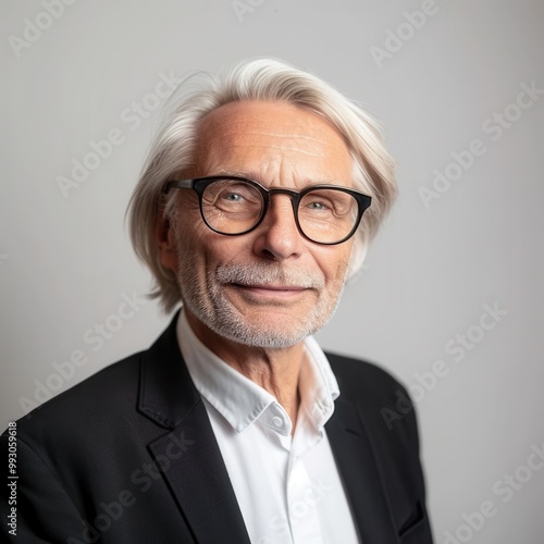 Portrait of a distinguished European man in his 70s with white hair and glasses, exuding confidence and wisdom