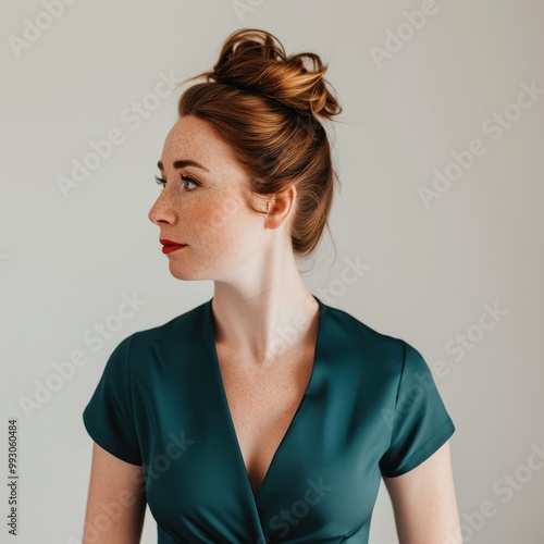 Confident young woman in her late 20s with striking red hair and freckles gazing thoughtfully to the side in a teal dress