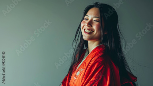 Smiling Japanese woman in red outfit with long black hair