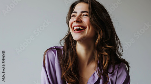 Joyful Middle Eastern woman with long brown hair in her 30s wearing a purple blouse