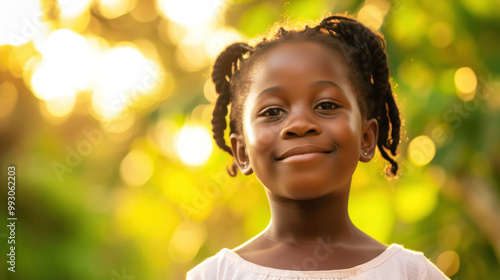 Radiant Ghanaian girl smiling in natural sunlight with blurred background