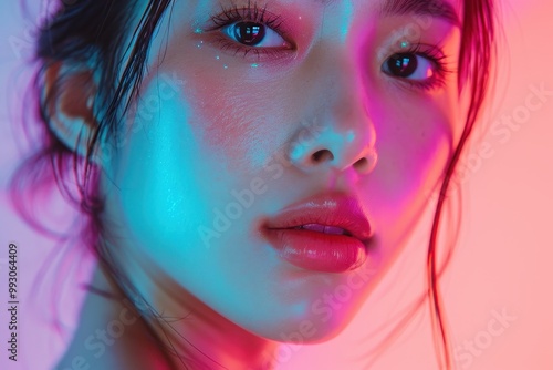 Close-up portrait of a youthful woman with glowing skin under colored lighting