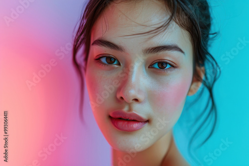 Central Asian teen portrait, neon colored beauty and skin care concept