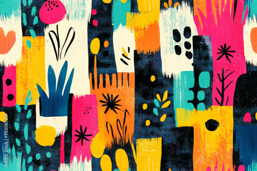 Abstract contemporary art collage with vibrant geometric shapes and colors creating a dynamic and visually stimulating composition on a clean white background.