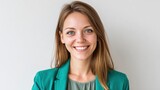 Cheerful Czech businesswoman posing confidently on a professional background
