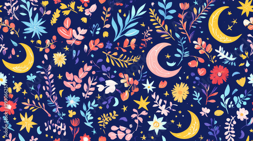 Colorful seamless pattern with crescent moons, stars, and floral motifs