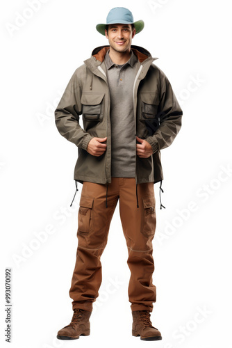 Full body shot of a friendly male safari guide in khaki attire and hat