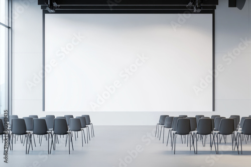 Black and white minimalist cinema hall with large screen and modern seating design in a spacious environment
