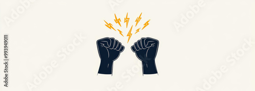Minimalistic collage of two raised fists with lightning bolts representing power and energy on a simple backdrop