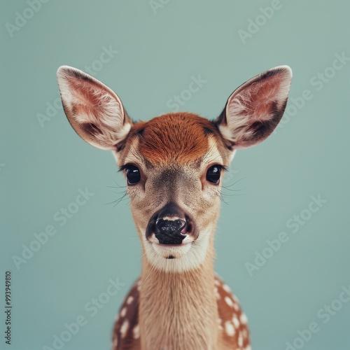Cute deer portrait in studio setting showcasing natural beauty and innocence of young white-tailed deer. Wildlife photography highlights delicate features and calm expression against blue background.