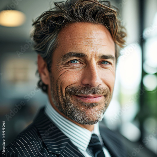 Confident mature Caucasian businessman in his 50s with short gray hair wearing a suit and tie against a neutral background